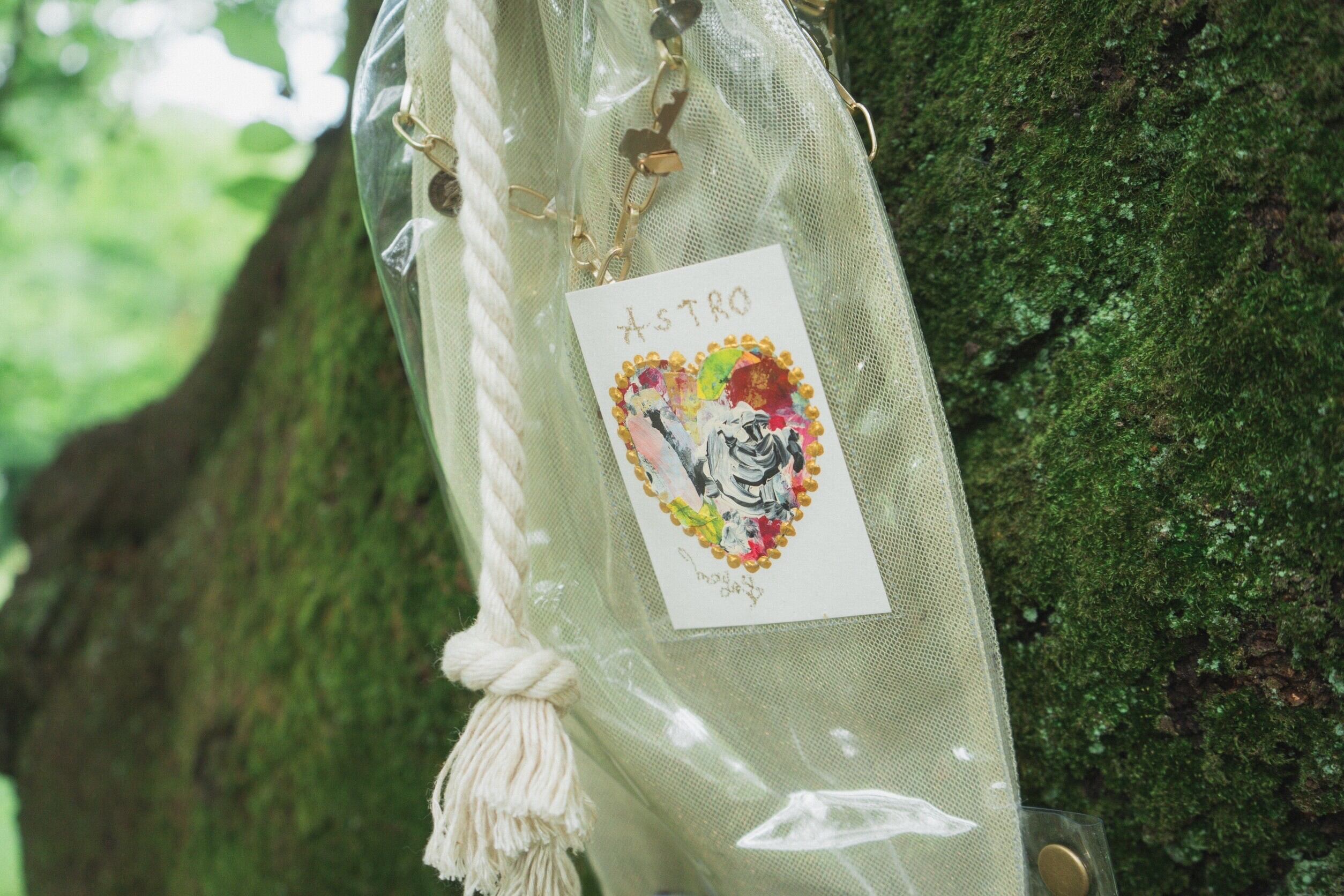 外付けのアウトポケットに土星の色彩をイメージしたmaya Shibasaki直筆、Cosmic Hartを忍び込ませ+アクリルキーホルダーで贅沢に仕上げました。
